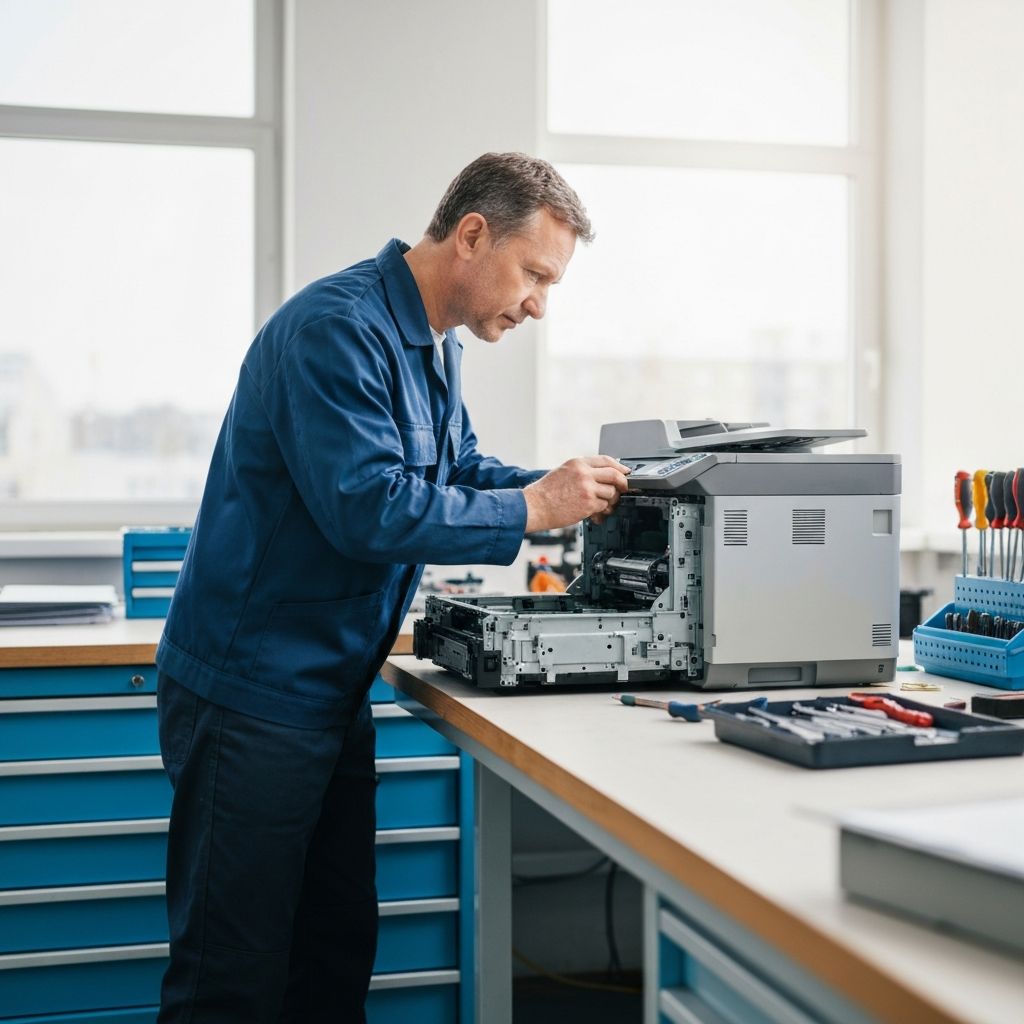 Solución de problemas de impresoras y escáneres. Reparación de mecanismos de papel, cartuchos y componentes electrónicos.